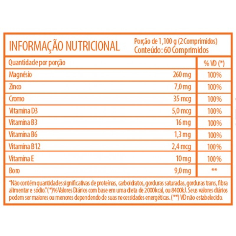 Ingredientes: Mix de vitaminas e minerais (magnésio, zinco, cromo, niacina, piridoxina, cobalamina, colecalciferol, tocoferol, boro) estearato de magnésio, glaceante ácido esteárico, antiumectantes celulose em pó e dióxido de silÃcio, corante amarelo RD&C 5 e RDC 6. Colorido Artificialmente. Aromas: guaraná, pimenta preta, pimenta vermelha, laranja. NÃO CONTÉM GLÚTEN.